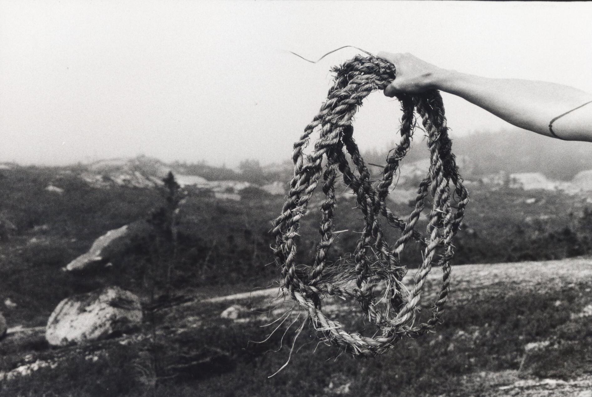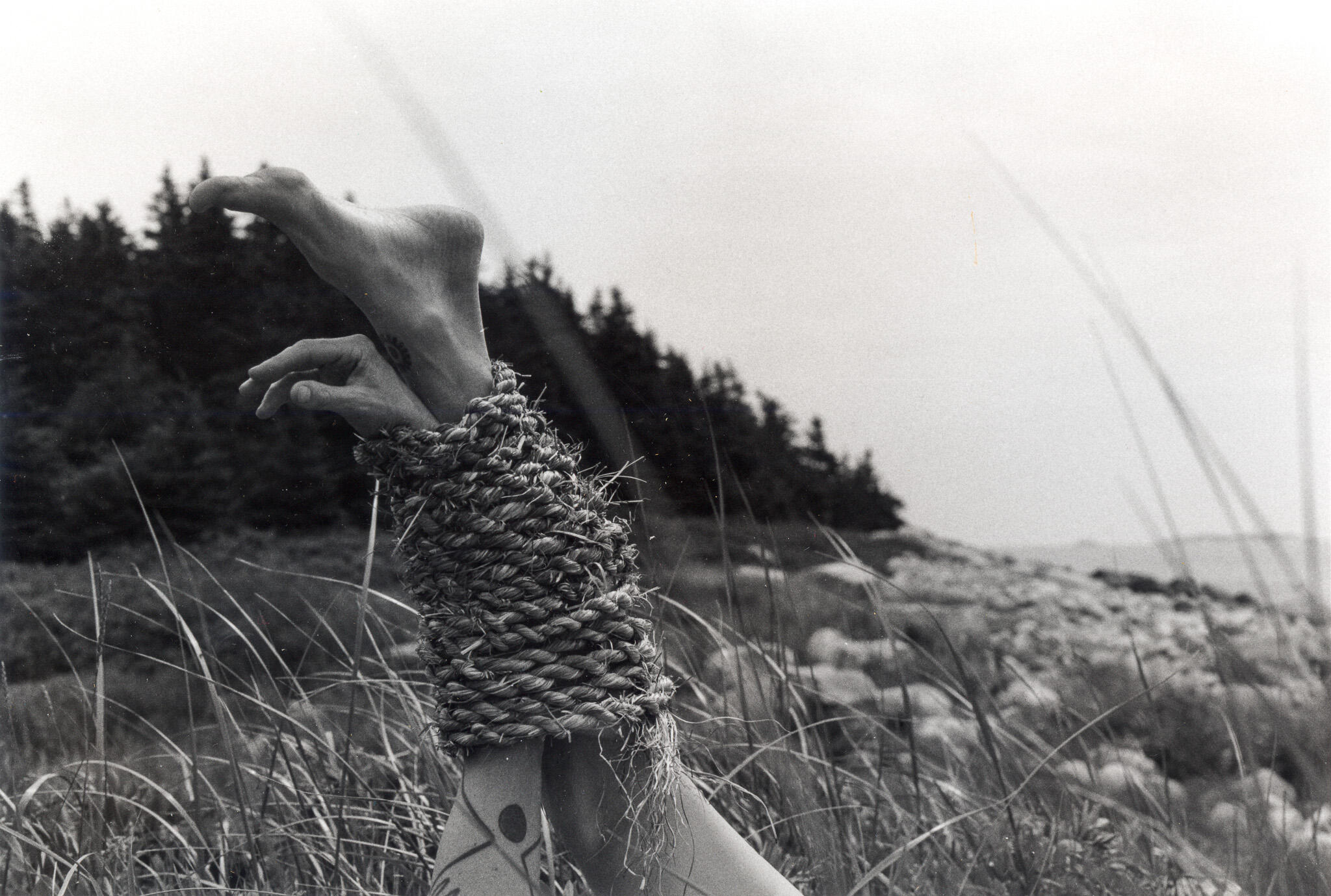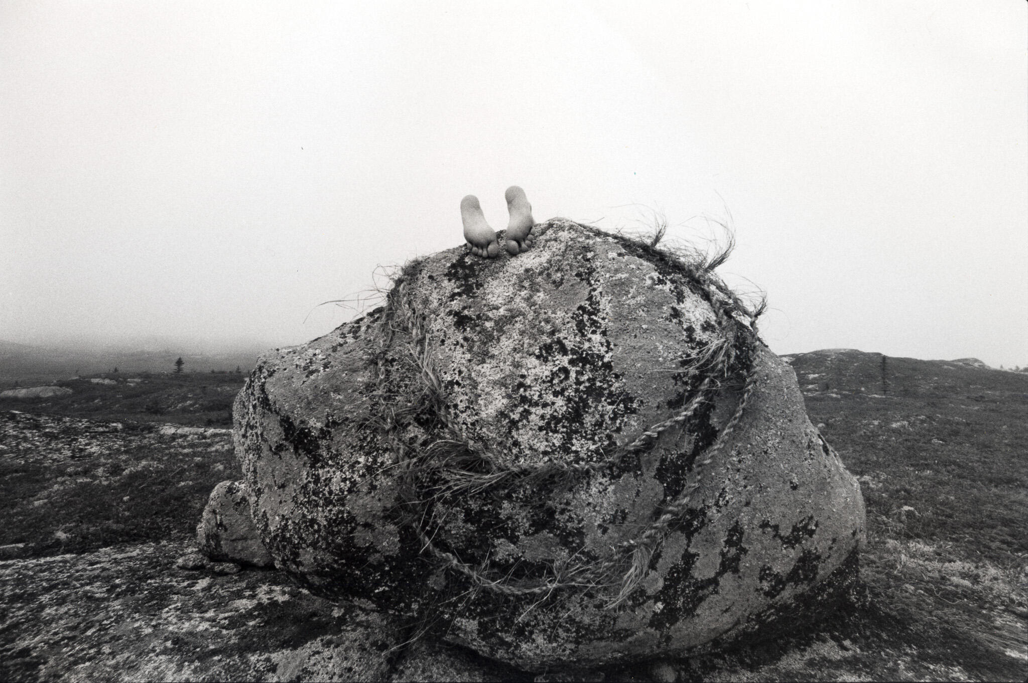A Gathering of Good Tension is the first collaboration between settler artists Kit Holden-Ada and Ellen Timbre, shaped by a curious and emergent confluence of practice (craft/art), of bodies (human/ land/water/plants) and of time (past/present/future). Combining elements of their jewellery/metalsmithing, installation, film photography, book & box making practices, the piece is comprised of 11 silver gelatin prints shot in various locations in Mi’kma’ki, simmens (traditional Orcadian handmade rope), and a hand constructed box (with lichen dyed linen book-cloth & metallic foil) which serves as a vessel for the rope and the photographs.