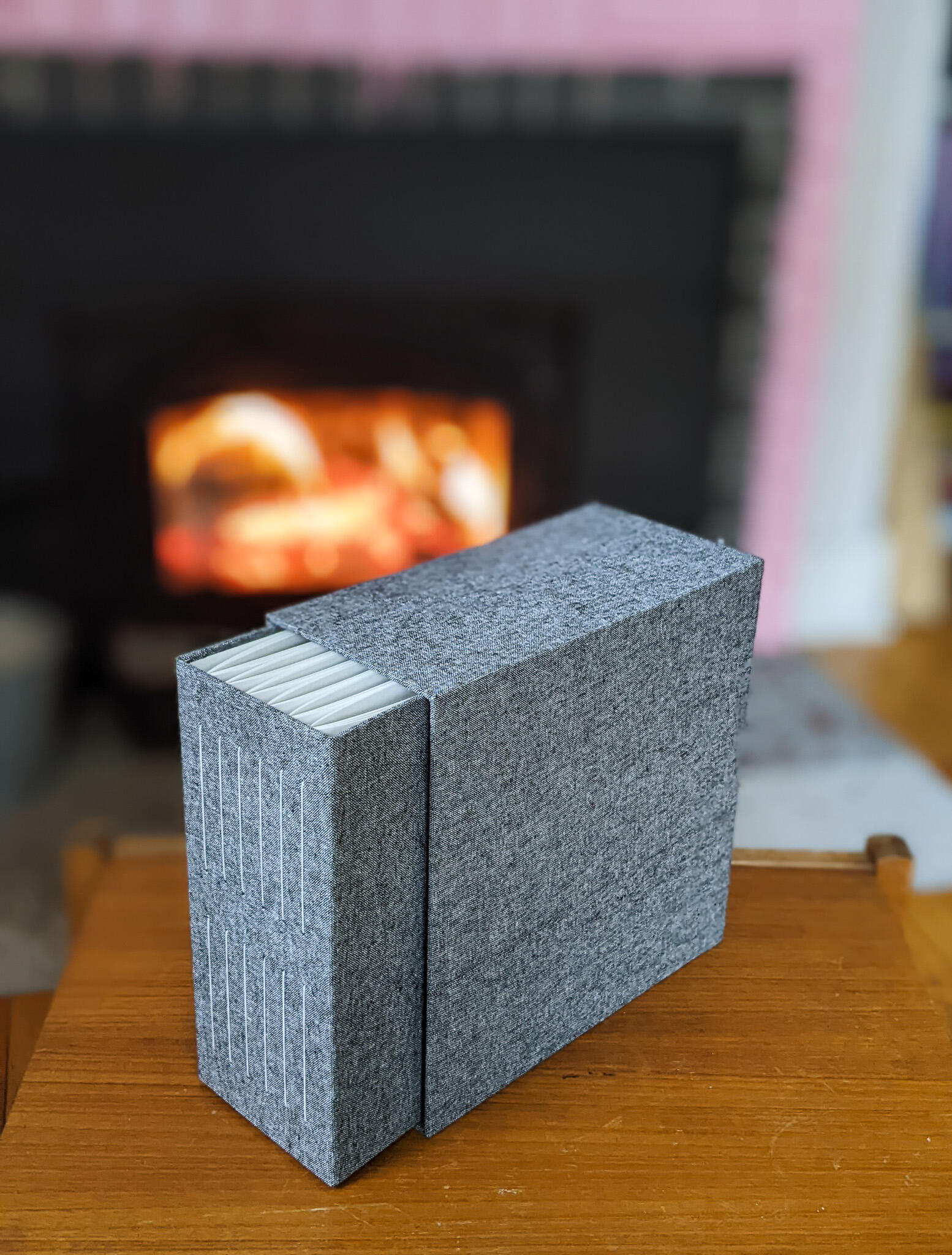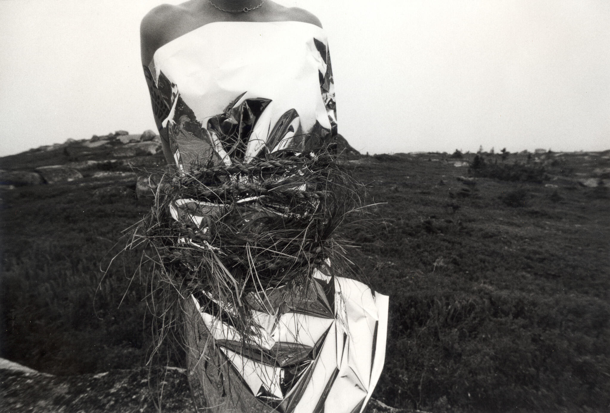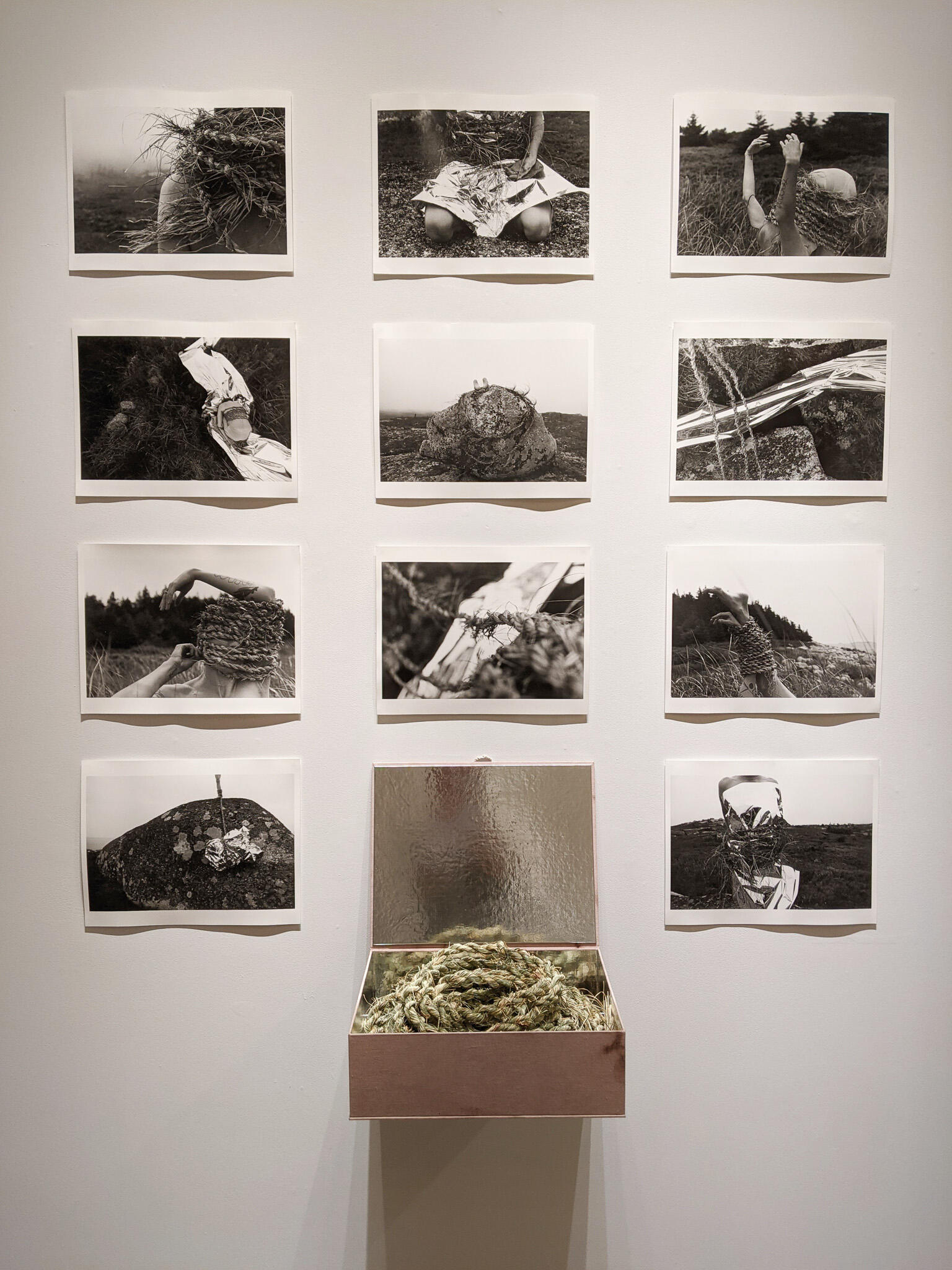 Emerging from years of relationship building and conversation, this current work reflects explorations around growing our capacities for discomfort and staying present with the harm inherent in our lineages as settlers. The interplay of body, landscape, rope, and the reflective material woven throughout the images represent complex entanglements of history, self-reflection, tension and presence; grounded through and held within the handmade box, inside which viewers have the opportunity to see their own likeness reflected.